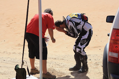 I had covered about 270 's or so of special stage and still felt perfect so decided to get into it a bit as there was only 40 k's to go, through the dunes like a boat in ocean swell, rolling with them, I was enjoying it, then one caught me out, two fast off a drop of and I fell to the side as the bike went down my head slamming into the side of the dune, a little rattled I picked up the bike, quick inspection, everything including me beside a mouthful of sand and off I went again reaching the finish line shortly after, then with a 120 k liaison to the bivouac. Now a funny thing happened on this liaison, of course I had been re hydrating like nothing else, drinking so much water so not to get dehydrated in the desert, another big thing that stops riders. But i had dank clearly way to much and was consistently busting for a pee, eventually I had to stop by the side of the road to relieve one self, as I did I was so busting that when I went number one and and actually farted number two decided to rear its ugly head, as one would say. Hell here I was now with a problem, I swung my leg over the bike and stood up all the way to the next fuel station, climbed off my bike in front of a few Arab's who looked amazed, here's this rider all kitted up, with a race number and looking like I was apart of a major event, which I was, wondering off to the loo. cleaned myself up, lost the underwear and rode all the way to the bivouac minus my jocks!!! Anyway as it turned out I managed to have the 17th fastest time of the day, i was stoked with my efforts and felt still on top of things, not tired and looked forward to the next day.
